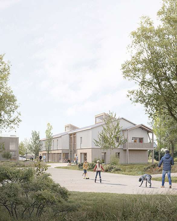 Le programme se compose de 9 maisons bioclimatiques (T4 et T5 de 80 à 91 m²), chacune dotée d'un jardin privatif. Construites en ossature bois et conçues avec des matériaux biosourcés, elles intègrent une halle climatique en façade, véritable régulateur naturel : elle capte la chaleur en hiver, favorise la ventilation en été et garantit un confort optimal toute l'année.