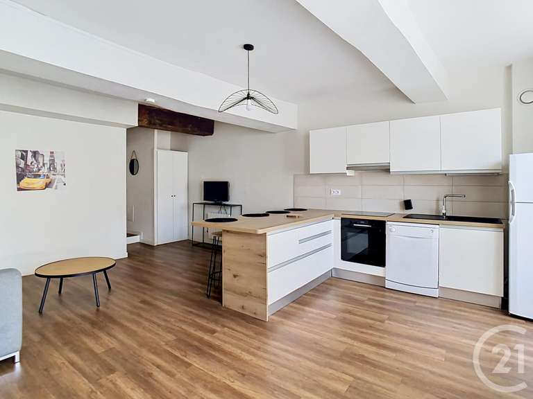 Appartement T2 avec cuisine aménagée et équipée ouverte sur le séjour, une chambre avec placard et une salle de bains avec WC.