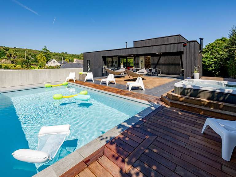 - Au rez-de-chaussée : Hall d'entrée, séjour salon avec poêle à granulés, salle à manger avec cuisine équipée à l'américaine ouvrant sur terrasse et jardin Sud-Ouest, suite parentale avec salle d'eau et WC, chambre, salle d'eau, WC et buanderie ;
