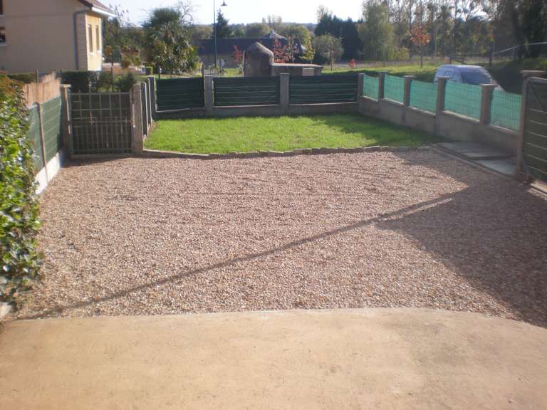 Portes fenêtres donnant accès à la cour avec un coin pelouse le tout clôturé.