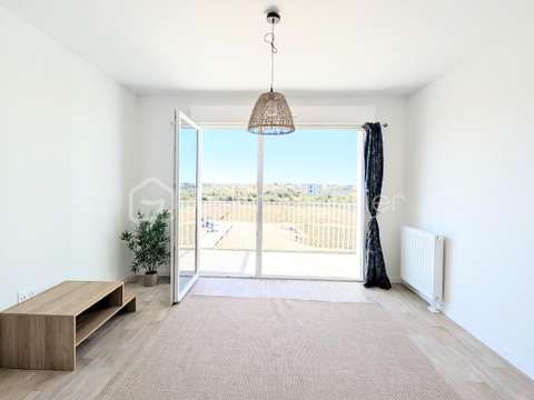 Une pièce de vie conviviale avec cuisine aménagée et équipée, ouverte sur un balcon,