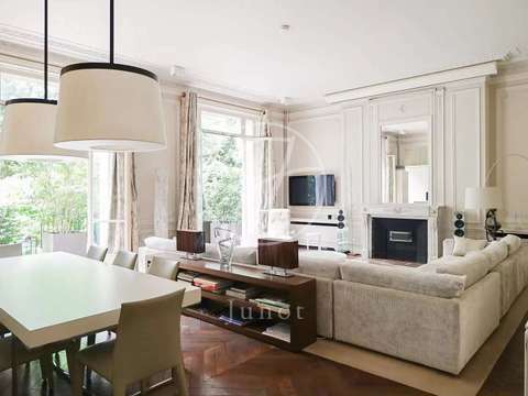 Dans un très bel immeuble ancien, cet appartement d’architecte au caractère exceptionnel d’une superficie de 315m² loi Carrez bénéficie d’un magnifique jardin paysager privatif de 260m².Situé en rez-de-jardin, ce bien rare s’ouvre sur une vaste entrée avec vestiaire et toilettes invités, qui mène à un élégant salon de réception directement sur le jardin, sublimé par une hauteur sous plafond de 3,50m. Une grande cuisine dînatoire entièrement équipée complète l’espace de vie.La partie nuit comprend une suite parentale avec dressing, salle de bains attenante et grande baignoire, avec un accès direct à un espace bien-être en souplex composé d’une salle de massage et d’un sauna. Trois autres chambres, toutes avec leur propre salle de bains et toilettes, complètent l’ensemble, dont une actuellement aménagée en salle de sport.Dans le jardin, on retrouve une très jolie terrasse, […] Voir l’annonce immobilière >>