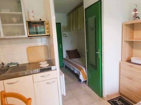 L'intérieur est entièrement meublé et équipé. Il se compose d'une pièce principale, lumineuse et agréable, équipé d'une grande porte fenêtre en double vitrage, d'un lit simple, d'un canapé lit, d'une télévision, d'un coin cuisine aménagé avec un évier simple, une taque électrique, un frigo, un micro onde et un espace pour prendre les repas créant un espace de vie confortable et convivial. La salle d'eau est équipée d'une douche, d'un lavabo et d'un WC offrant tout le confort nécessaire pour une personne seule ou un couple.