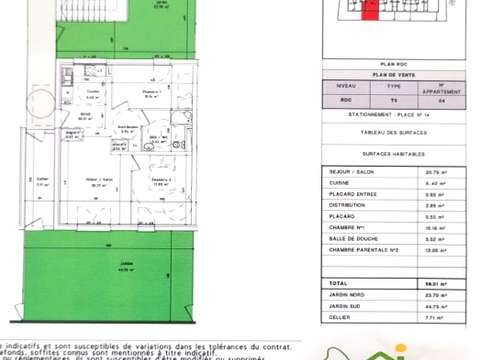 situé en rez-de-jardin et comprenant une cuisine ouverte sur séjour avec accès direct au jardin 68m2 privatif exposé SUD, 2 chambre, salle d'eau avec wc.