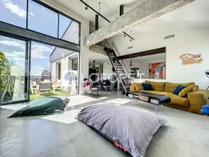Près de 5 mètres de hauteur sous plafond, poutres en béton brut, sol en béton ciré : l'ensemble crée une atmosphère à la fois contemporaine et chaleureuse. L'immense baie vitrée en double hauteur baigne l'espace de lumière naturelle et offre une vue dégagée, sans vis-à-vis, entre ville et nature.