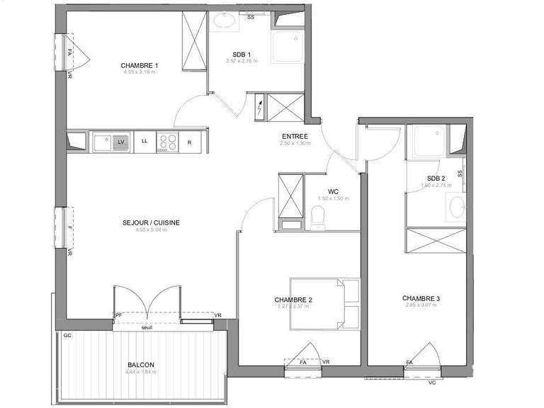 D’une surface d’environ 81 m² environ, il se compose d’une entrée, d’un séjour spacieux avec cuisine ouverte, de trois chambres, de deux salles de bains, ainsi que d’un toilette indépendant.