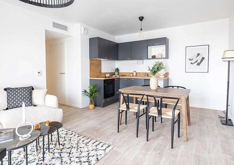 L'agencement intérieur a été étudié avec attention afin de proposer des volumes équilibrés et une circulation agréable. Le logement comprend une entrée, un séjour lumineux avec cuisine ouverte, idéal pour partager des moments conviviaux dans un espace de vie moderne et chaleureux.