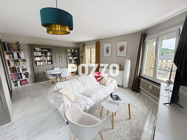 RARE...En plein centre de VIRE, aux pieds des commerces et d'une école, dans un immeuble en copropriété avec seulement deux propriétaires et un syndic bénévole sans charge de copropriété, au 2ème étage, appartement T5, 4 chambres en triplex, lumineux, à rafraîchir de 112 m2 habitables, grande cave de 11.45 m2 au sous-sol, comprenant :