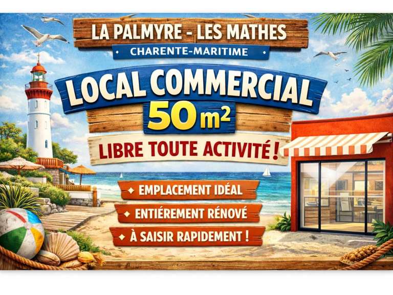 Idéalement situé au cœur de la station balnéaire prisée de La Palmyre, sur la commune des Mathes en Charente-Maritime, découvrez ce local commercial de 50 m², libre de toute activité et offrant de nombreuses possibilités d'exploitation.