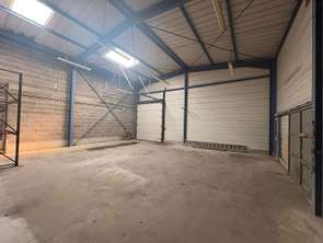 A l'arrière un local de stockage d'environ 120 m2 avec un espace bureau / sanitaire d'environ 26 m2. Accès par une porte sectionnelle motorisée abrité par un auvent permettant du stockage extérieur au sec.