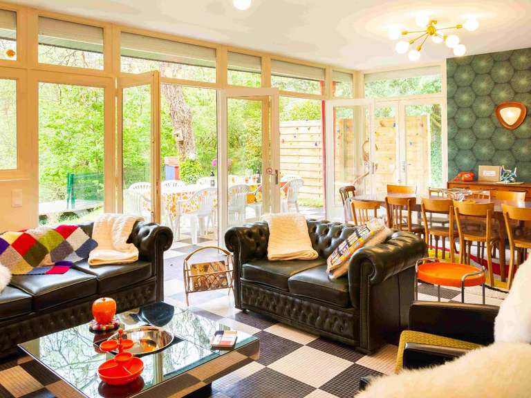 L’entrée mène à une cuisine aménagée, puis à un vaste salon-séjour traversant, avec des baies vitrées ouvrant sur la terrasse et l’étang. L’atmosphère y est chaleureuse, renforcée par le poêle à bois. L’espace nuit se compose de trois chambres, toute de plain-pied, d’une salle de bains avec baignoire et douche, et d’un WC indépendant.