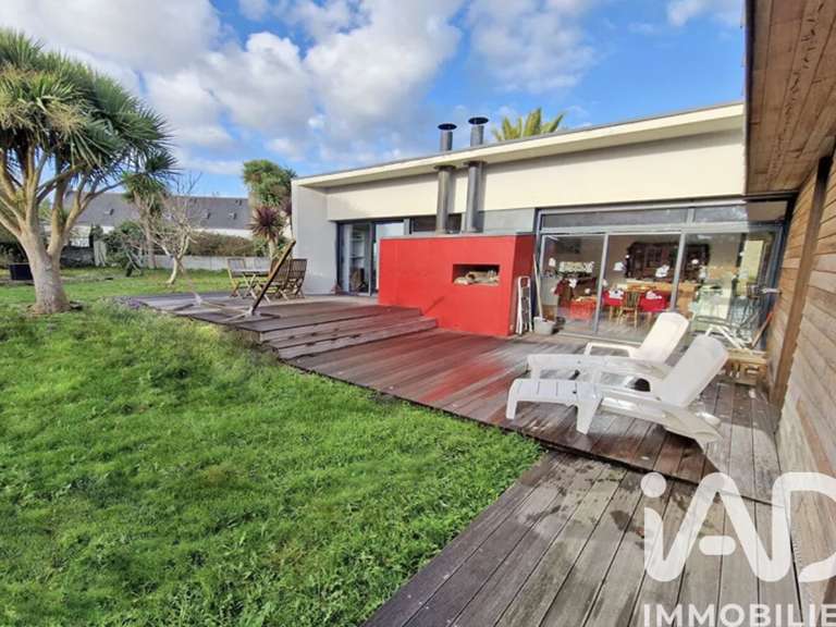 iad France - Nathalie Le Bricquer vous propose: A 3 km de la mer - Au centre de GUIMAEC - MAISON D’ARCHITECTE de 2005 de plain pied avec de beau volume et très lumineuse avec une belle terrasse plein sud composée d’une entrée avec placard, grande pièce de vie avec cuisine équipée ouverte sur séjour salon avec cheminée de 68 m², 3 belles chambres dont 1 seule parentale avec salle d’eau privative, 1 salle de bain et wc, arrière cuisine, cave de 20 m², carport, jardin clos de 1075 m². Portail motorisé. Beau jardin de 1075 m². COUP DE CŒUR ASSURÉ !