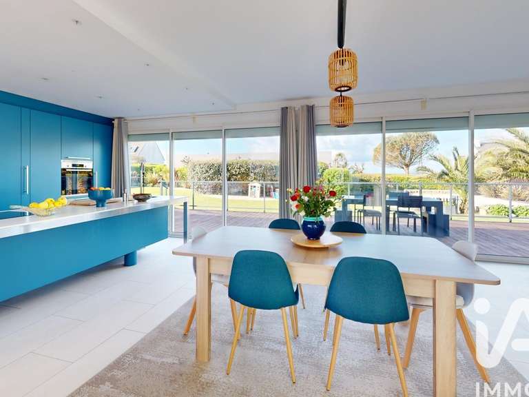 iad France - Nathalie Segalen vous propose: PLOZEVET - BIEN RARE DE PLAIN-PIED AVEC PISCINE - A 1 km du bord de mer, très belle maison d'architecte construite de plain-pied en 2007 par un architecte de renom, édifiée sur une parcelle de 1344 m2 environ, orientée sud-ouest, elle bénéficie d'une très belle luminosité. Elle se compose d'une entrée, d'un magnifique salon-séjour avec cuisine ouverte (équipée et aménagée) de 65 m2 environ, en accès direct sur une confortable terrasse en bois de 62 m2 environ vue mer & jardin, cheminée avec insert, 3 chambres dont une suite parentale avec salle d'eau et dressing, une salle d'eau, wc indépendant. Le jardin paysagé et les aménagements extérieurs particulièrement soignés apportent une vraie détente ainsi que la piscine chauffée de 10 x 6 m (en copropriété - Juridiquement en utilisation exclusive). Un sous-sol atelier-buanderie avec douche pour les retours de plage, une cabane de jardin, local technique, abri et un bucher viennent compléter ce bel ensemble pour une grande facilité de rangement. Dotée d'un système de chauffage au sol (pompe à chaleur), elle offre un grand confort thermique. Un interphone et portail électrique assurent la sécurité des lieux. Espace parking aménagé pouvant accueillir 4 à 5 voitures. Accessibilité Handicap. Commerces et commodités à 2 kms, à 2,3 kms du petit port de Pors Poulhan, à 10 kms du port d'Audierne. Une opportunité à ne pas manquer dans un environnement calme, très recherché proche de la mer.