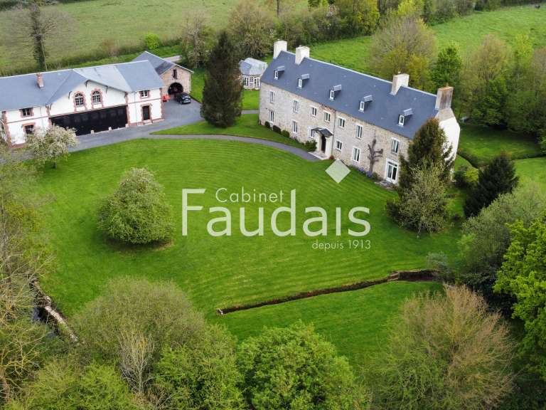 Dans les hauteurs de la vallée de la Vire, avec 22 ha de terres, un château des 13e et 15e s. inscrit MH. Aux abords de la ville, une longue allée goudronnée bordée de marronniers descend vers l'entrée de la propriété. À mesure de l'avancée, le paysage se fait moins urbain et les pelouses de chaque côté s'élargissent. La voie atteint un portail en fer forgé soutenu par deux solides piles en moellon de schiste, que prolongent des murets surmontés de grilles. À proximité, une chapelle a été construite en hauteur. Sur un côté, l'allée longe une dépendance qui sert de garage puis aboutit à une tour carrée. Le château est dressé sur un promontoire, avec en toile de fond les bois […] Voir l’annonce immobilière >>