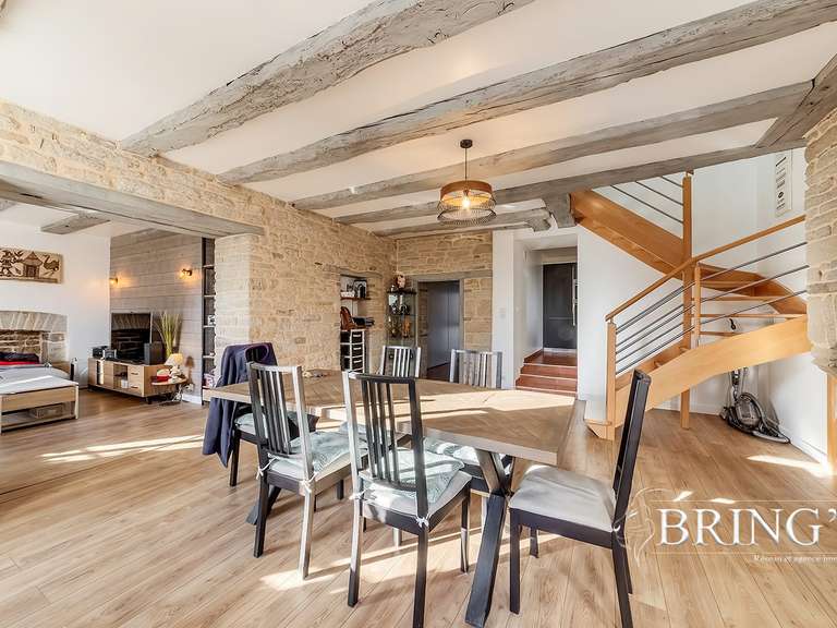 À l'étage, vous découvrirez un appartement spacieux et chaleureux, rénové avec des matériaux de qualité et une attention particulière portée aux finitions.