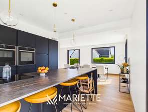 A l'intérieur, l'atmosphère se veut chaleureuse et épurée. Les volumes généreux sont subtilement mis en lumière dans chaque pièce, offrant une sensation d'espace et de sérénité. Les nombreuses ouvertures traversantes permettent une agréable exposition est-ouest, invitant naturellement la lumière à accompagner les espaces de vie vers le jardin. Les vues dégagées sur les extérieurs rappellent à chaque instant le calme et la douceur de ce cadre privilégié.