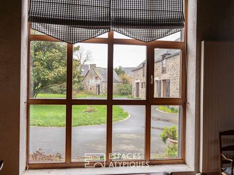 La grande pièce de vie s'ouvre sur le salon-séjour et la cuisine avec cheminée à foyer ouvert en granit, le sol en dalles de grès devant de cheminée en pierre de granit taillé trône sous le toit Cathédrale d'une belle hauteur sous plafond de 7.70m