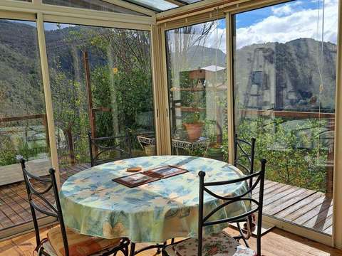 Au rez-de-chaussée se trouve une cuisine ouverte prolongée par une véranda lumineuse offrant une vue dégagée sur les montagnes. Le salon, d’une superficie de 24 m² environ et exposé sud-est, est équipé d’un poêle à bois et complété par un second système de chauffage au granulé, assurant une performance thermique adaptée aux variations saisonnières.