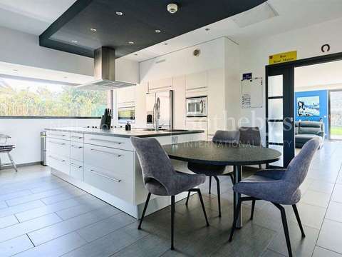 La cuisine semi-ouverte, de très belle dimension, entièrement équipée (plan de travail en pierre, électroménagers encastrés, nombreux rangements), intègre un espace repas quotidien. Une grande buanderie complète l’ensemble.