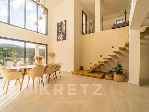 Dès l’entrée, le ton est donné : un hall avec vestiaire ouvre sur une pièce de réception aux volumes généreux, baignée de lumière grâce à de vastes baies vitrées toute hauteur, prolongeant naturellement les espaces de vie vers les terrasses ombragées, le solarium et les terrasses de la piscine. La cuisine ouverte, au design épuré et entièrement équipée, s’accompagne d’un cellier et d’une buanderie, alliant esthétisme et fonctionnalité.