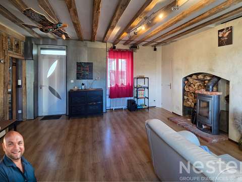 Une belle pièce de vie traversante baignée de lumière, avec son poêle à granulés pour des soirées chaleureuses.