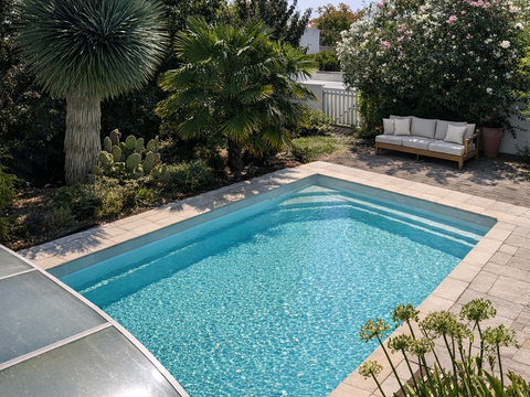 À l'extérieur, le jardin, à l'abri des regards, soigneusement aménagé et arboré accueille une piscine au sel sous dôme, invitant à la détente en toute saison et un jacuzzi 5 places dans l'un des 2 patios.