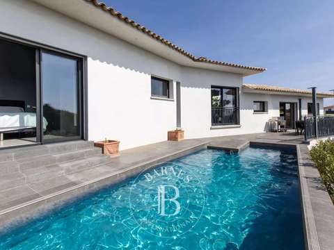 D'une surface généreuse, la villa se compose d'un vaste séjour lumineux avec un salon et salle à manger avec une cheminée moderne, d'une cuisine ouverte entièrement équipée avec goût, d'un cellier et d'une très grande buanderie.