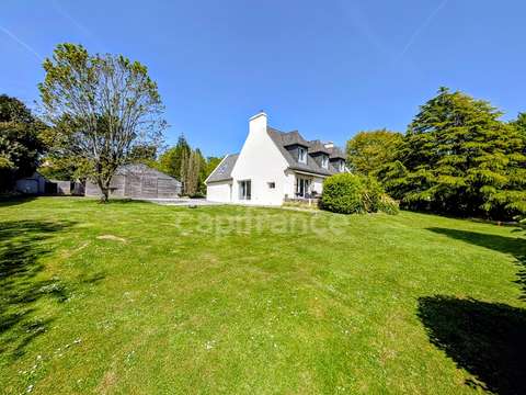Soigneusement nichée dans son écrin de verdure, dans le très calme quartier du Carn, cette élégante néo-bretonne édifiée sur les hauteurs de Loperhet se dresse fière et sereine au fond de son allée.