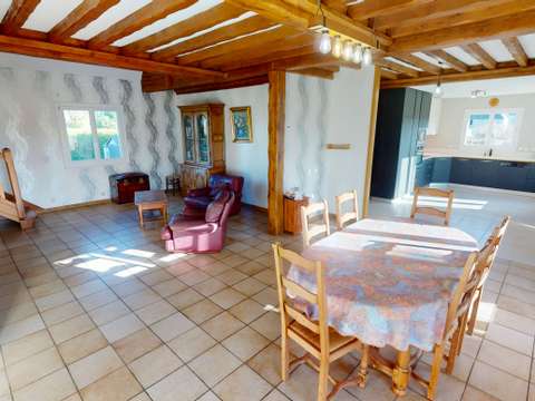 A quelques minutes du centre de Bayeux et 20 minutes de Caen. Beau pavillon de construction traditionnelle de 135 m² comprenant : entrée, séjour/cuisine aménagée et équipée avec poele à bois, loggia et terrasse, WC, couloir desservant deux chambres et salle de bains. A l'étage: palier de 17 m², couloir desservant deux chambres avec placards et salle d'eau avec WC. Sous-sol complet avec buanderie /chaufferie, garage pour 2 voitures et atelier. Différentes annexes à usage de voilière et abri à bois. Jardin arboré de 880 m² . A moderniser.