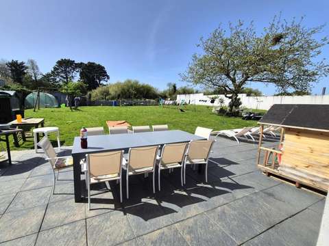 Dès l'entrée, vous découvrez une magnifique pièce de vie d'environ 100 m², baignée de lumière, comprenant un salon, un séjour et une cuisine aménagée et entièrement équipée. Les grandes baies vitrées permettent une ouverture fluide sur le jardin clos de 1 415 m², parfait pour profiter des beaux jours en toute intimité.