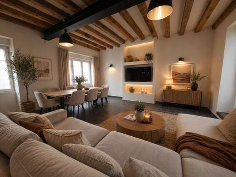 Dès l'entrée, vous serez séduits par une pièce de vie lumineuse et chaleureuse, composée d'une cuisine aménagée et équipée récente d'environ 20 m², ouverte sur un salon-séjour d'environ 35 m².
