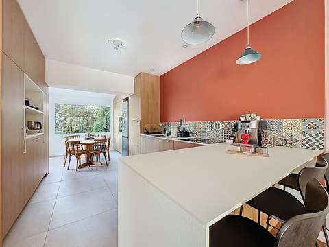 La cuisine, généreuse et parfaitement pensée, s’ouvre naturellement sur cet espace. Fonctionnelle, spacieuse, conviviale : elle accompagne la vie de famille comme les réceptions. Une arrière cuisine jouxte celle-ci.