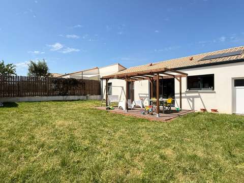 Garage attenant, terrain clos de 380m2 comprenant terrasse avec pergola et abri de jardin.