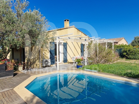 iad France - Caroline Barral vous propose: Saint-Dionisy – Vaunage – Maison de plain-pied avec piscine, carport, Terrasses, jardin clos et arboré – DPE B