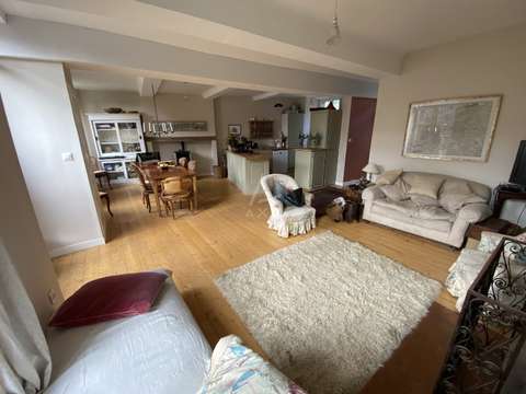 Superbe pièce de vie de 50 m2 avec cuisine ouverte aménagée et équipée, poêle à bois et accès à une belle terrasse ensoleillé en bois, 3 chambres dont une suite parentale avec dressing et salle d'eau, salle de bains, buanderie.