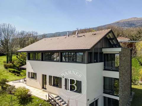 DIVONNE SOTHEBY'S INTERNATIONAL REALTY vous présent une magnifique maison contemporaine de standing, située dans un environnement résidentiel prisé et recherché. Édifiée en 2022 sur un terrain de près de 800 m², elle bénéficie d’un panorama spectaculaire sur les Alpes, le Mont-Blanc et le Jura.