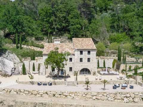 Construite en 2019, cette bastide en pierre de 327 m² s’élève sur un terrain paysager de 7 682 m² en position dominante, offrant une vue dégagée sur les collines et le village de Tourrettes.
