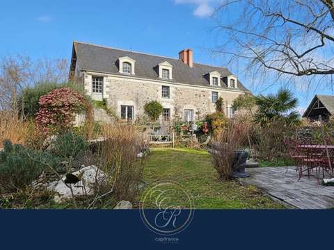 Ancienne ferme à chanvre soigneusement réhabilitée, la demeure développe plus de 270 m² habitables sur deux niveaux. La rénovation, menée avec une exigence remarquable, met en valeur des matériaux nobles et des savoir-faire d'exception : charpente par les Ateliers Perrault Frères, cheminées anciennes dont l'une issue d'un prieuré du XVIIᵉ siècle, parquets remarquables, lambris en châtaignier, sols en pierre naturelle et toiture en ardoises traditionnelles des Ardoisières d'Angers.