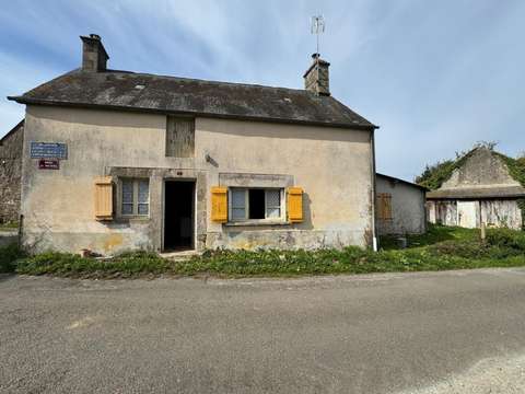 Une maison ancienne, construite en pierres, toiture en ardoise, comprenant une cuisine avec un poêle à bois, une chambre avec cheminée à foyer ouvert, une salle de bains avec W.C.