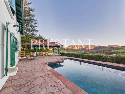 À l’abri des regards, au cœur d’un environnement préservé, cette ancienne ferme basque rénovée avec soin conjugue authenticité et confort contemporain, dans un esprit sobre et élégant.La rénovation a été réalisée avec des matériaux de qualité, dans le respect des codes architecturaux basques. Implantée sur un terrain d’environ 750 m², la propriété offre une vue panoramique et dégagée sur les Pyrénées. Les espaces extérieurs, aménagés avec attention, invitent aussi bien à la convivialité qu’au calme, et permettent de profiter pleinement du paysage et des différentes ambiances du jardin.Actuellement exploitée en chambres d’hôtes, la maison se prête tout autant à un projet de résidence principale ou secondaire, idéale pour accueillir famille et amis. Développant environ 250 m² habitables, elle se compose de 11 pièces, dont 7 chambres et un dortoir, offrant une belle capacité d’accueil.Plusieurs espaces dédiés aux loisirs viennent enrichir la propriété : une pièce de jeux, un espace baby-foot, un espace billard ainsi qu’un terrain de pétanque. Une piscine, un espace extérieur abrité avec sa terrasse ainsi qu’un garage complètent l’ensemble, permettant de profiter pleinement des moments de détente et de confort, en intérieur comme en extérieur.Un lieu confidentiel vous offrant une rénovation […] Voir l’annonce immobilière >>