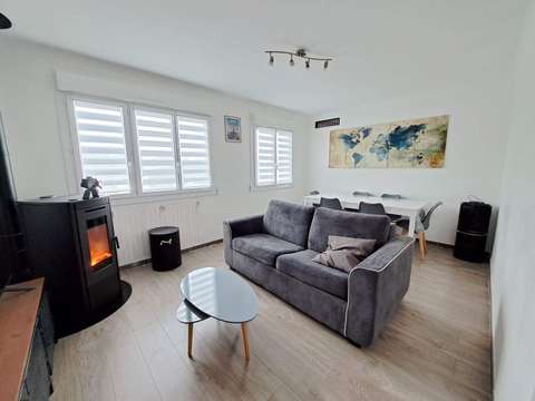 - Une cuisine aménagée et équipée de 15 m² ouverte sur un salon/séjour de 16,50 m² avec poêle à granulés, deux chambres de 11,50 m² et 12,80 m² dont une avec dressing, une salle d'eau et un WC.