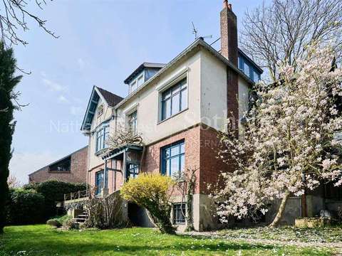 L’entrée dessert un vaste séjour d’environ 55 m², intégralement parqueté, offrant de beaux volumes lumineux et un accès direct à l’exceptionnel jardin exposé plein Sud. La cuisine indépendante, à conforter, a su préserver ses matériaux d’origine. Un bureau complète les volumes du rez-de-chaussée.