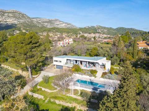 Dans le village très prisé de Lascours, au cœur d’une Provence authentique et recherchée, se dévoile une maison d’architecte contemporaine de 2017, d’environ 200 m², nichée au calme absolu, sans vis-à-vis, et entourée d’une nature luxuriante.Ici, le temps semble suspendu. La propriété offre une vue panoramique exceptionnelle sur le Garlaban, véritable tableau vivant, changeant au fil des saisons.Dès l’entrée, la maison séduit par ses volumes généreux et sa lumière omniprésente. La pièce de vie élégante et chaleureuse s’ouvre pleinement sur une vaste terrasse grâce à de superbes baies vitrées à galandage, invitant l’extérieur à faire partie intégrante du quotidien.La cuisine Leitch, à la fois design et fonctionnelle, s’intègre harmonieusement à cet espace de vie pensé pour le partage et la convivialité.Les prestations sont à la hauteur du lieu :parquet au sol, climatisation, finitions soignées et matériaux de qualité.La maison propose quatre chambres, avec salle de bain et salle de douche, dont une suite parentale avec sa salle de bain et son dressing privatif, offrant confort, intimité et douceur de vivre.À l’extérieur, le charme opère immédiatement. Une grande piscine s’inscrit dans un écrin de verdure, véritable poumon vert, idéal pour se détendre, recevoir ou simplement profiter du silence et de la beauté environnante.Un grand garage pouvant accueillir […] Voir l’annonce immobilière >>