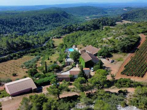 EXCLUSIVITÉSITUATION : En situation dominante sur la vallée qui va vers la mer en passant par Béziers, à côté de St Chinian, 30 mn d'une gare TGV ou d'un aéroport, et 45 mn des plages. Sa position lui confère une intimité inégalable et un environnement sans aucune nuisance ! Le siteest très propice au développement d'une activité de réception et événementiel. BÂTIMENTS : Il y a 4 bâtiments:La maison principale, ample et lumineuse fait 350 m2, elle a été entièrement rénovée avec tout le confort, chauffage central et climatisation pour 7 chambres. Elle est agrémentée de cheminées et poêles à bois. Une immense cuisine d'été avec grandes baies vitrées qui s'ouvrent sur une immense piscine de 15 x 6 entourée de dalles de pierres.Une maison séparée sert de gite ou de maison de jardien avec ses grandes pièces et 3 chambres. Une chambre séparée supplémentaire avec mezzanine peut servir d'appoint. Ce bâtiment possède son garage et son atelier.Le bâtiment de cave vinaire fait 200 m2, avec une grande hauteur sous plafond, il est équipé de matériel de vinification. Il a vinifié jusqu'à 15 ha de vignes par le passé, et il serait possible de refaire cela immédiatement. Il y a des cuves béton et inox, un pressoir, etc. Un bâtiment de 240 m2 servait de chai à barrique et de caveau de vente et dégustations de vin. Le dessus de celui-ci sert de terrain de pétanque, avec vue sur la piscine, et parfois la mer qui scintille à l'horizon !Ces deux espaces se prêteraient parfaitement à la création d'une activité de mariages ou autres évènements.Un hangar à matériel se trouve un peu au-dessus, il fait environ 170 m2, avec grande hauteur sous toit.TERRES et VIGNES : Les 10 ha sont des garrigues sauvages et un peu moins d'un ha de vignes bio plantées en Grenache noir. Il y aura un hectare de vignes de plus bientôt. Il y a encore des possibilités de plantation. On trouve une oliveraie de 90 jeunes […] Voir l’annonce immobilière >>