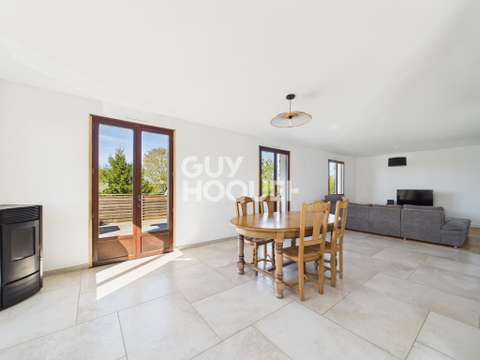 Dès l’entrée, vous serez séduit par une pièce de vie lumineuse, agrémentée d’un poêle à granulés, offrant un accès direct à une agréable terrasse surélevée de 30 m², parfaite pour profiter des beaux jours.