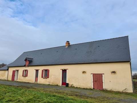 Fermette à vendre à Ligron dans la Sarthe (72), comprenant : cuisine, salle de bains, W.C., débarras, cave, séjour, deux chambres.