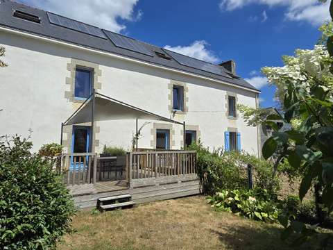 Arzano. Sud Finistère. A 25 minutes des plages et à 8 minutes de Quimperlé et de la voie rapide. Dans un environnement privilégié. A la campagne. Vue dégagée. Très beau corps de ferme en pierre organisé autour de trois bâtiments indépendants. Exposée sud, la maison principale offre, au rez-de-chaussée : entrée avec espace bureau, salon-séjour avec poêle à bois, cuisine aménagée et équipée, un second salon, salle d'eau et wc ; au premier étage : palier, une pièce avec couchage d'appoint, trois chambres (dont une avec salle d'eau, wc et dressing privatifs), salle de bains et wc ; au deuxième étage : dégagement, deux chambres et une vaste pièce à finir d'aménager. Terrasse bois avec accès aux jardinets d'agrément. Buanderie-chaufferie attenante. Parfaitement séparé de l'habitation principale, le gîte labélisé 'Clé Vacances' et 'Tourisme et handicaps' (locatif saisonnier au fort rendement) est configuré ainsi : au rez-de-chaussée : entrée, buanderie, pièce de vie conviviale avec cuisine aménagée et équipée, une chambre avec avec salle d'eau et wc privatifs ; à l'étage : dégagement, quatre chambres, lingerie, salle d'eau, salle de bains et trois wc. Terrasse sans vis-à-vis. Jardin privatif au gîte. En annexe, une grande longère (actuellement exploitée en atelier) pouvant faire l'objet d'une rénovation en habitation. Un hangar avec stationnements et un espace de jeux. Très beau terrain de 5318 m2 avec talus arborés et enclos pour animaux. Multiples équipements garantissant un confort optimum : isolation renforcée, chaudière à granules avec silo, panneaux solaires, réseau informatique, […] Voir l’annonce immobilière >>
