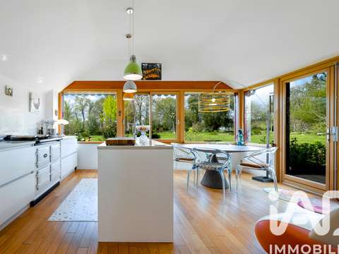 Dès l'entrée, le charme opère grâce à une rénovation irréprochable qui a su sublimer les éléments de caractère (pierres apparentes, poutres traitées, toiture en ardoise naturelle). Le rez-de-chaussée s'articule autour d'une chaleureuse pièce de vie de 41 m². Baignée de lumière grâce à ses grandes baies vitrées orientées plein Ouest, elle offre un panorama apaisant sur le grand jardin et bénéficie de la chaleur d'un poêle à bois Godin.