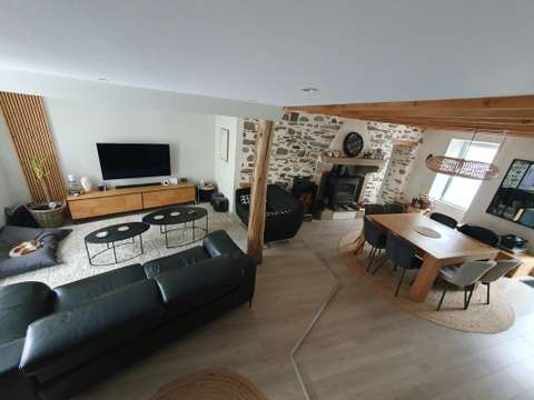 L'espace de vie se révèle à travers un salon-séjour cathédrale baigné de lumière, où la baie vitrée s'inscrit avec justesse dans l'empreinte originelle d'une ancienne ouverture de grange. Ce volume chaleureux, agrémenté d'un poêle à bois design, dialogue avec une cuisine dînatoire qui conserve son authenticité grâce à son îlot central et son foyer ancien. Véritable atout pour les belles soirées d'été, la cuisine s'ouvre directement sur une terrasse exposée plein sud. Une buanderie et des sanitaires complètent ce niveau, tandis qu'un système d'aspiration centralisée apporte un confort supplémentaire au quotidien. A l'étage, une passerelle en bois surplombe le séjour et dessert un espace bureau, trois chambres, dont une suite avec dressing, ainsi qu'une salle de bains avec douche et baignoire et des sanitaires indépendants.