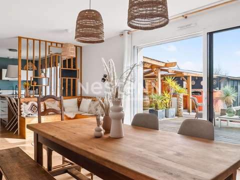 Dès l'entrée, vous serez séduits par une spacieuse pièce de vie lumineuse, conviviale et parfaitement agencée. Celle-ci comprend un salon-séjour chaleureux ainsi qu'une cuisine aménagée et équipée, ouverte sur l'espace de vie. De larges ouvertures permettent un accès direct vers l'extérieur, où vous pourrez profiter pleinement de la terrasse, de la cuisine d'été et de la piscine, idéal pour partager des moments de détente en famille ou entre amis.